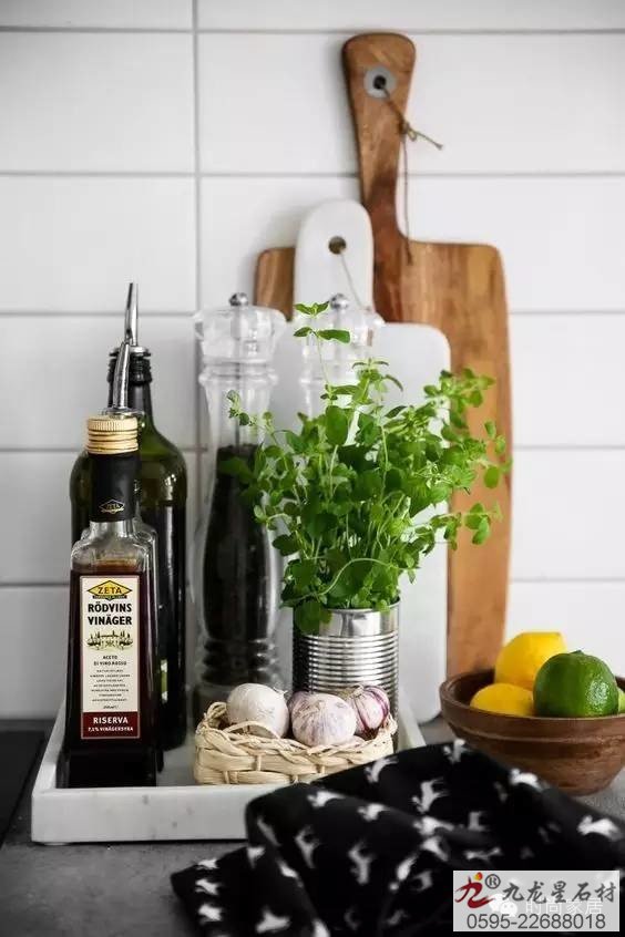 ↑大理石紋的托盤(pán)可以有一個(gè)。整齊的擺放上必備調(diào)料瓶,兼具收納功能哦。