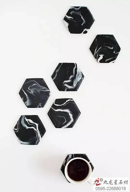 ↑六角形黑色大理石花紋的杯墊深邃又有型,拼起來(lái)還可以做隔熱餐墊,實(shí)用又好看。