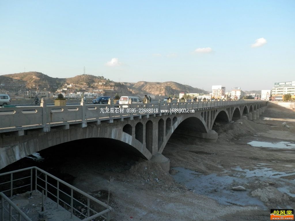 1987年,這座凝聚了綏德人智慧的千獅橋終于竣工了。馬金龍說,這座橋在綏德筑橋史上創(chuàng)造了許多之最,工程難度最大,橋身最長(311米),橋面最寬(10米加2×2米人行道),橋身最雄偉(13孔橋洞跨徑20米),用人最多(上萬人參加了修建),石獅子最多,投資最多(200多萬元),價值最大,建成后的綏德千獅橋北達包頭,南通西安,東串太遠,西連銀川。馬金龍還說,千獅橋之所以成了聞名遐邇的石雕藝術大橋,是因為它的三個特點,一是橋身傾斜20度;二是空腹聯(lián)合石拱,即大拱肩上有小拱;三是南丁字路口有1座功德碑,北丁字路口有1座抗金民族英雄韓世忠大雕像,橋上有4座古色古香的涼亭,4根凜凜的龍柱,60塊精美的浮雕,更令人驚嘆不已的是橋上雕刻著1008只石獅子,成了天下第一獅橋。