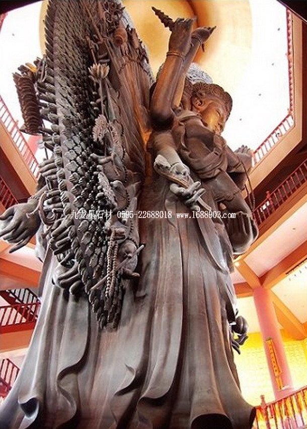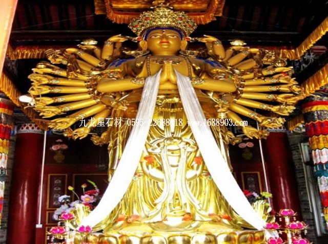千手觀音是我國(guó)民間信仰的六大菩薩之一。千手觀音是阿彌陀佛的左脅侍,與阿彌陀佛、大勢(shì)至菩薩(阿彌陀佛的右脅侍)合稱為“西方三圣”。據(jù)佛教典籍記載,千手觀音菩薩的千手表示遍護(hù)眾生,千眼則表示遍觀世間。