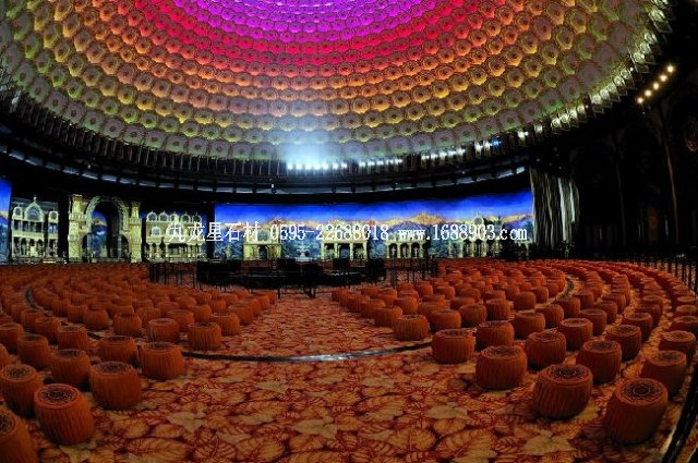 梵宮中最重要的地方莫過于圣壇,這是一個(gè)集會(huì)議、演出、參觀于一體的圓形場館,也是世界佛教論壇的主會(huì)場。建筑面積達(dá)35000平方米,可以舉行2000人的大型國際會(huì)議。圣壇上方是高度達(dá)30多米的巨大穹頂,1500盞金光燦燦的蓮花燈瞬間開啟,剎那間千余盞由電腦控制的LED光源拱聚穹頂,仿佛星光燦爛的天穹,可以變幻出1100多種燈光變化。三維立體的舞臺(tái),可以在1分半鐘內(nèi),在舞臺(tái)中央“長出”一棵10米高、12米寬、11萬余片樹葉的參天菩提大樹。同時(shí),在幾十臺(tái)大型投影設(shè)備和目前世界最為先進(jìn)的數(shù)字燈光控制系統(tǒng)綜合作用下,營造出一種既似如夢如幻、又似身臨其境的美妙景象。由林兆華、何訓(xùn)田等組成的國內(nèi)頂尖團(tuán)隊(duì)導(dǎo)演排練的,以弘揚(yáng)傳統(tǒng)文化、啟迪心靈智慧為主旨的大型情境演出《覺悟之路》就在此上演。