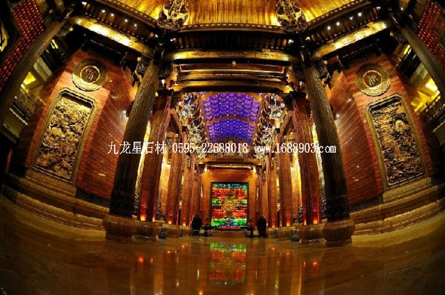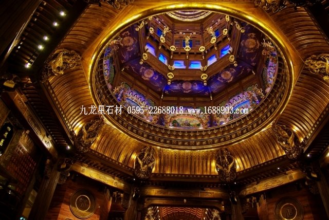 梵宮的內(nèi)部,舉目可見東陽木雕、敦煌壁畫、揚(yáng)州漆器、景泰藍(lán)、琉璃、溫州甌塑等等藝術(shù)珍品。能將如此眾多的中國非物質(zhì)文化遺產(chǎn)納入一座建筑的,目前似乎只有梵宮,也因此,有人稱它為“東方的盧浮宮”。由于梵宮顛覆了中式宗教建筑的傳統(tǒng)理念,舍棄了中國傳統(tǒng)佛教建筑慣用的木頭、琉璃瓦等材料,而用鋼筋混凝土建造,因而為設(shè)計(jì)施工帶來了很大難度。