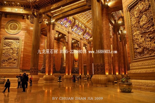 這些木雕均出自浙江東陽一班木雕藝人之手。浙江東陽是中國木雕之鄉(xiāng),北京故宮及蘇、杭、皖等地都有精美的東陽木雕留世。據(jù)統(tǒng)計(jì),整座靈山梵宮的木雕裝飾面積達(dá)1.5萬平方米,用掉2400多立方米的原木。比如一座塔廳高就有65米,跨度為46.6米,面積為2000多平方米,這樣的空間規(guī)模在東陽木雕裝修工程中,從無先例,這比在故宮施工還要難!為此東陽幾乎傾全縣之力,42個(gè)廠家,1560多名工匠,從2007年底接手,連續(xù)制作1年零4個(gè)月才最終順利完工。