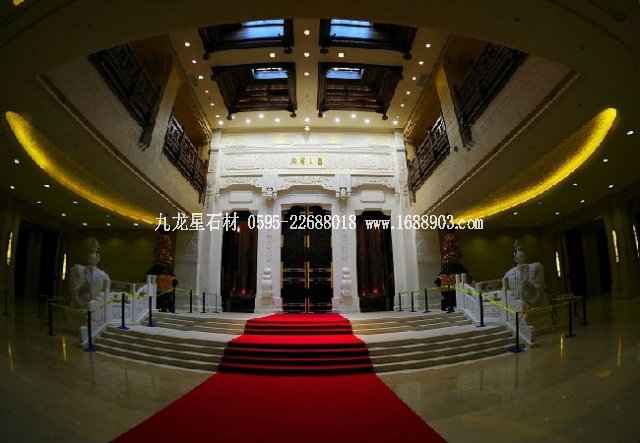 門廳是梵宮的交通集散樞紐。門廳面寬約110米,進(jìn)深18米;東側(cè)通道通往餐飲區(qū)域,西側(cè)通道通往會(huì)議區(qū)域。正面三扇仿石窟造型的金色大門是梵宮主入口,通往廊廳。整個(gè)門廳主色調(diào)呈佛教傳統(tǒng)的明黃色,給人以平靜祥和之感。漢白玉鋪就的地面清新典雅,莊嚴(yán)而古樸,透明的四格天窗與下方的圓壇遙相呼應(yīng),柔和而自然。陳列于門廳兩側(cè)高達(dá)3.8米的東陽木雕精品“和諧雙瓶”,為東陽木雕傳人陸光正大師的問鼎之作,寓意和諧美好。