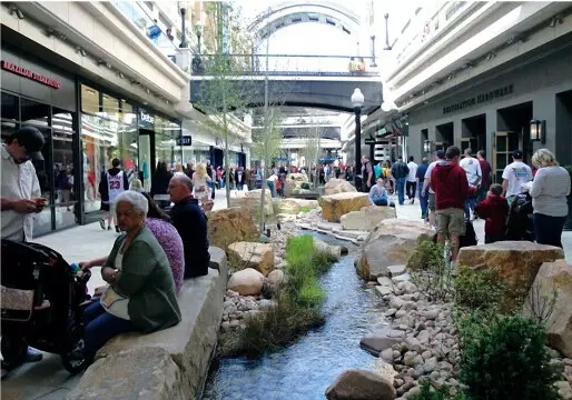溪流石景使城市商鋪中多了自然元素,成為一道別致風(fēng)景線,吸引更多人前來,同時(shí)提供了沿路休息的座位。