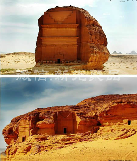 Mada’in Saleh 也被稱為Al-Hijr(巖石場),位于北漢志(今沙特阿拉伯),是猶太人和納巴泰人所居住的一座古老的城市,也被成為海格拉(詛咒之地)。這里被發(fā)現(xiàn)的一些銘文可追溯到公元前兩千年。然而,所有保留下來的建筑元素可以追溯至公元前1世紀(jì)和公元后第二個(gè)世紀(jì)的Thamudi,Lihyan和納巴泰文明時(shí)期。Mada’inSaleh不僅是沙特最壯觀的旅游景點(diǎn),它也是世界最偉大的歷史遺跡之一。在清晨的日光中,石墓呈現(xiàn)給人的是一種非凡的美麗,陽光中投射下的影子和石墓形態(tài)各異,更給Mada’in Saleh真正增添了幾分魅力。其姊妹城市---佩特拉,納巴泰王國前首都,位于約旦邊境北部150公里。