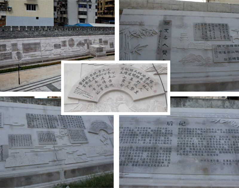 浮雕墻設(shè)計(jì)內(nèi)容:1、尤溪賦;2、歷史文化墻為:拓土開(kāi)疆、高伏獻(xiàn)圖、開(kāi)元建縣、盧珖守城、宋咸治縣、林積還珠、沈括謫尤、金屬冶煉、韋齋舊治、一代宗師、重教興學(xué)、居敬孝道、凌輝治吏、田頊博學(xué)、詹榮護(hù)國(guó)、瓜瓞聯(lián)芳、譫思為政、民俗風(fēng)情、紅軍入境、淞滬請(qǐng)纓、和平解放、山鄉(xiāng)巨變、走向未來(lái)