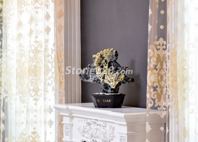 在新中式風(fēng)格的大廳中,石雕作品的外形與背景窗花的菱形相互協(xié)調(diào),取得了很好的諧調(diào)效果。石雕的色彩與整體環(huán)境的深色調(diào)相互統(tǒng)一,臘梅花典雅的黃色又活躍了色彩的意境氛圍。整體空間的直線風(fēng)格與石雕作品的曲線造型相對比,剛?cè)嵯酀?jì),收放有度,取得了很好的視覺效果。