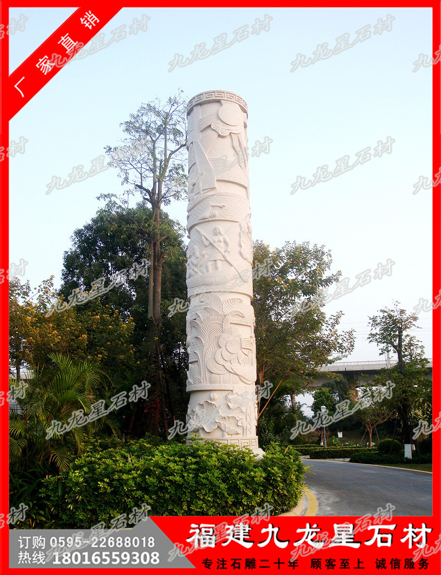 我國的廣場景觀文化柱子石雕除了具有圖騰性質(zhì)和紀(jì)念性的華表、墓表之外還有許多寺廟中宣揚(yáng)宗教教義、經(jīng)文的文化柱,到了近現(xiàn)代文化柱除了紀(jì)念性之外更多的作為宣傳歷史文化、民族文化、傳統(tǒng)文化等的載體而出現(xiàn)。比如曾作為2009年中華人民共和國建國60周年國慶的慶典背景之一的民族團(tuán)結(jié)柱就是紀(jì)念性和文化性的綜合體。它們的紀(jì)念性體現(xiàn)在:民族團(tuán)結(jié)柱共五十六根,象征五十六個(gè)民族,整體色調(diào)為中國紅和金黃色,柱頭柱礎(chǔ)為蓮花紋飾和卷草紋的結(jié)合與人民大會堂的門柱圖案元素一致,相互呼應(yīng)。寓意56個(gè)民族團(tuán)結(jié)在黨中央周圍,建立民主政權(quán),共同享有民主權(quán)利,柱身為各民族吉祥紋樣以及載歌載舞的場景,體現(xiàn)人民歡慶建國60周年的喜悅之情。他們的文化性體現(xiàn)在:每根文化柱上都雕刻著一個(gè)民族的文化符號,包含每個(gè)民族特有的文化元素和文化符號,很好的展現(xiàn)了每個(gè)民族的文化特色。
