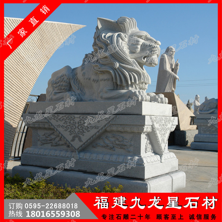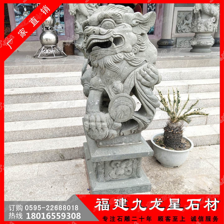 石雕動(dòng)物獅子的腦門(mén)寬闊隆起,天庭飽滿(mǎn),下頜裂開(kāi),地閣方圓.眼窩深,眼球鼓,鼻根深陷,張嘴似欲吞欲笑,多呈憨態(tài).毛發(fā)呈卷曲紐狀,自然地附著頸項(xiàng)部,更顯得威而不怒,猛而不殘.石獅有雌雄兩種:雄獅口含圓珠,耳呈葉狀,兩邊超過(guò)卷毛高度,毛發(fā)卷曲很有規(guī)律,布滿(mǎn)了耳、頸部。有時(shí)腳蹬繡球,表示其性貪玩耍.而雌獅身上多背小石獅子,或足下踩小石獅,表示一種"母愛(ài)",很有情趣,一般情況下,門(mén)左置雄獅,門(mén)右置雌獅。