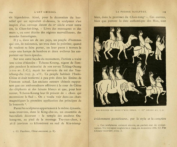 Paléologue《中國(guó)藝術(shù)》一書(shū)中的孝堂山拓片插圖。圖片來(lái)源:Paléologue, Maurice, “La Pierre Sculptée”, L'art chinois, 1887 (Paris : Maison Quantin), pp.134-135.