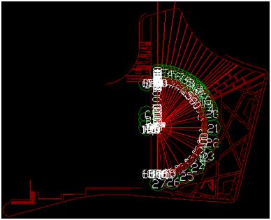 2、在建立軸網(wǎng)時,因景觀類工程一般沒有標準的縱橫軸線和軸線標識,所以需要充分利用已有的電子版CAD圖。在識別CAD圖時,可以把主要畫圖要用到的定位線作為軸線提取,如硬質(zhì)鋪裝和綠化邊線、人行道路沿線、林蔭步道的邊線、臺階邊線等;把其他需要輔助畫圖的線作為軸線標識提取,如綠化盲溝線、雨污水井邊線等??傊M可能地多導入CAD圖里面的線條元素。本工程導入CAD后如圖: