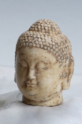 佛造像是佛教的載體,通過對佛造像年代、工藝、造型及風(fēng)格的研究,有助于認(rèn)識(shí)和了解古代雕刻藝術(shù)、文化史,古人的審美情趣以及古代的政治、經(jīng)濟(jì)和科技發(fā)展水平??v觀佛造像制作材料,有木制、泥塑制、金屬制、牙骨制、陶瓷制和石制。其中以石刻雕制的難度最大,因?yàn)樗婕笆系倪x擇、開采、運(yùn)輸,體大量重,雕刻打磨實(shí)屬不易。唐代石刻佛造像是把人與精神、現(xiàn)實(shí)與理想完美地結(jié)合在一起的最佳表現(xiàn)形式。那么就請大家一同欣賞這尊唐代漢白玉佛首的神韻和藝術(shù)感染力以及由此帶給我們大家的宗教、歷史、文化等方面的信息吧。