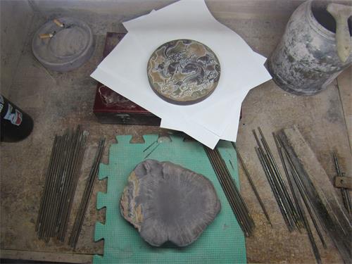 工作臺上放著一方尚未完工的硯臺,是幾朵的蘑菇的形態(tài)。應(yīng)調(diào)研團成員的要求,胡楊老師給調(diào)研團的成員們展示了現(xiàn)場雕刻,他用一根細長頭尖的鑿子輕輕地雕刻一只爬在蘑菇上的螞蟻,每一鑿,不論力度還是位置都十分精準(zhǔn),令調(diào)研團成員非常欽佩贊嘆。胡楊老師表示自己還是很向往大師陳端友歷時三十載制成九龜荷葉形端硯的精雕細琢,他們應(yīng)該將生活節(jié)奏放慢,只有摒棄五光十色的浮華,寧靜淡泊,才可以在石雕雕刻的道路上有所感悟、有所收獲。