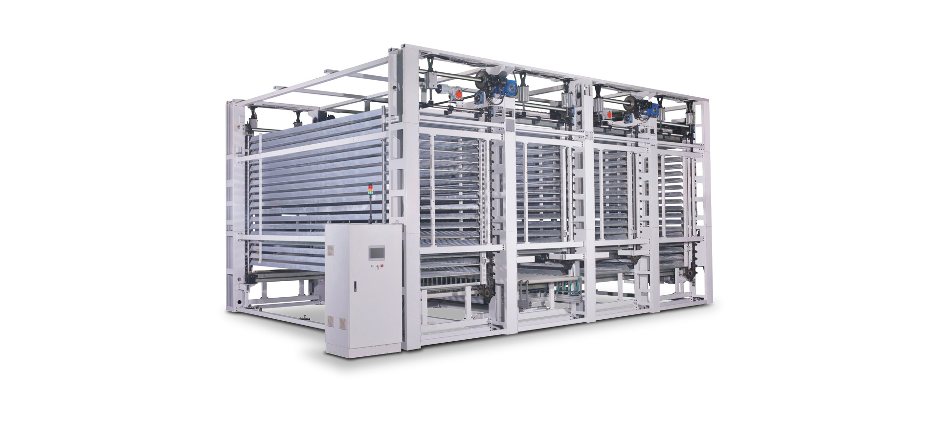 利用機器上部空間,采用立體式結(jié)構(gòu),適用于規(guī)格較為統(tǒng)一的實木家具、實木復(fù)合門、美式櫥柜、套房家具、衛(wèi)浴柜、展示柜、工藝品、裝飾板等板式工件,進行自動化噴漆后的長時間(30~120分鐘)的待干,實現(xiàn)在線連續(xù)干燥作業(yè),噴漆后的長時間待干能夠兼顧流平性、光滑性和漆膜干燥的性能。